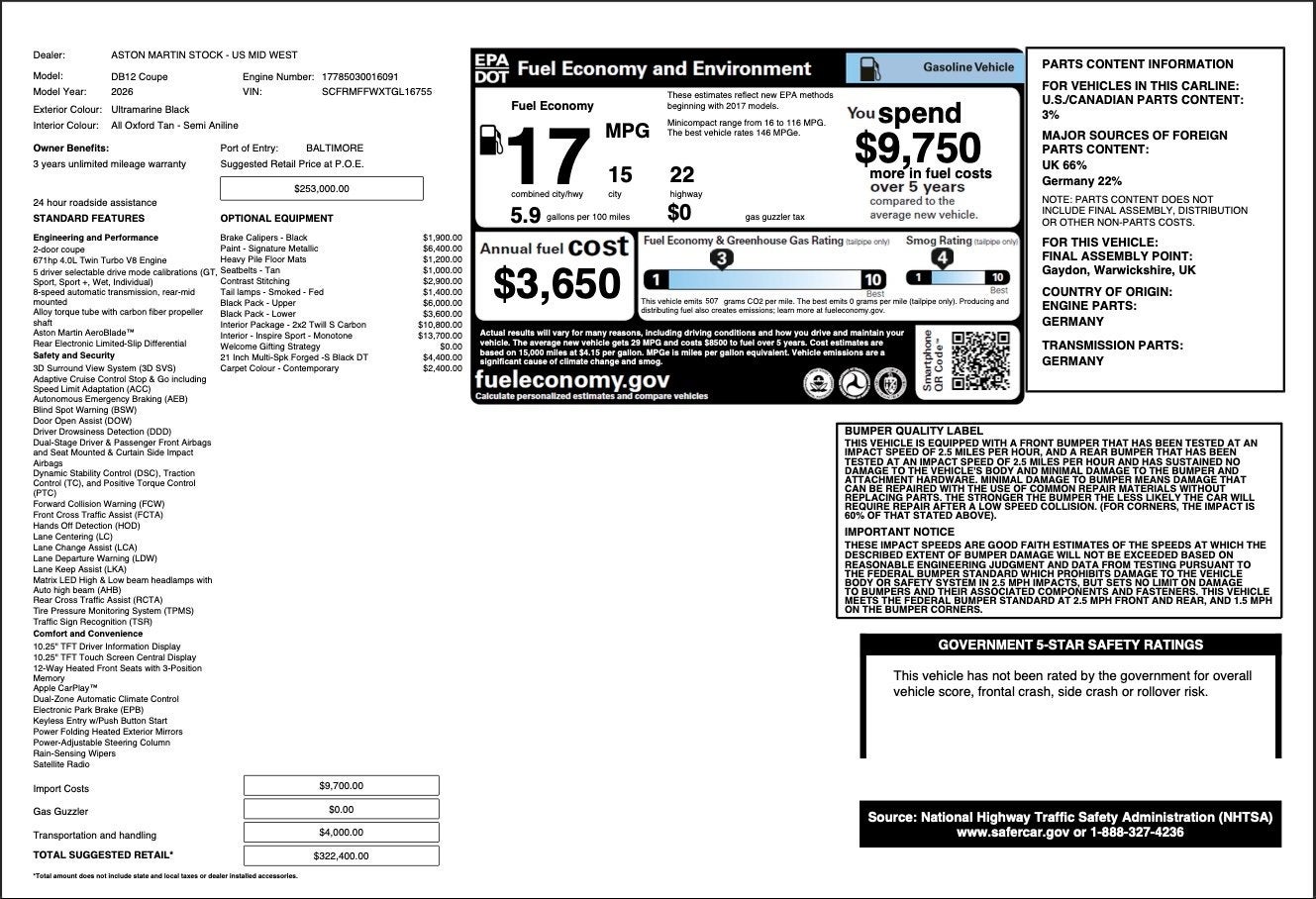 Slide into the meticulously appointed cabin where Oxford Tan leather and Inspire Sport Monotone Interior elevate every drive into a luxurious experience. Details such as Contrast Stitching, Seatbelts in Tan, and Heavy Pile Floor Mats speak to the bespoke nature of this interior, while the 2x2 Twill S Carbon Fiber Interior Package adds a contemporary and performance-driven ambiance. A tailored Welcome Gifting Strategy further enhances the Aston Martin ownership experience.