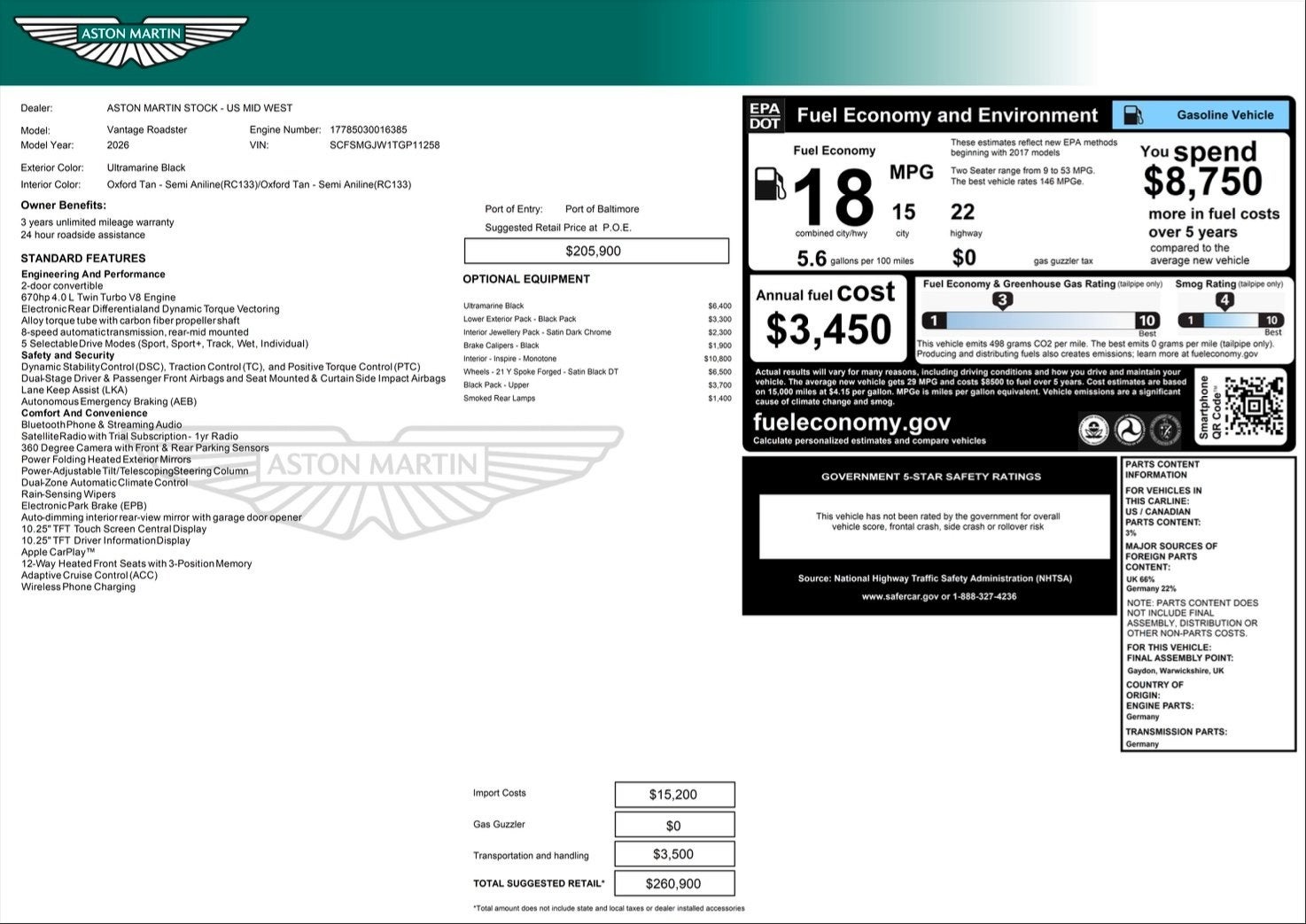 - Fuel Economy Est-Combined (MPG): 18 (Est)