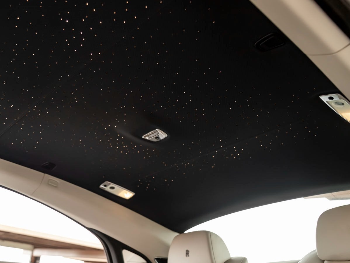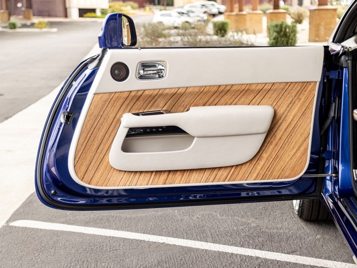 Inside, the cabin is a true sanctuarymeticulously crafted and richly appointed. The Seashell and Navy Blue color combination creates a striking contrast, enhanced by Contrast Stitching and a richly tailored Bespoke Interior. The iconic Starlight Headliner transforms each evening drive into an unforgettable experience, while indulgent touches like Lambswool Footmats, RR Monogram to All Headrests, and Color Keyed Boot Trim underscore the Wraiths unmatched attention to detail. Finishing the ambiance is the exquisite Canadel Paldao wood trim, adding warmth and distinction throughout the cabin.