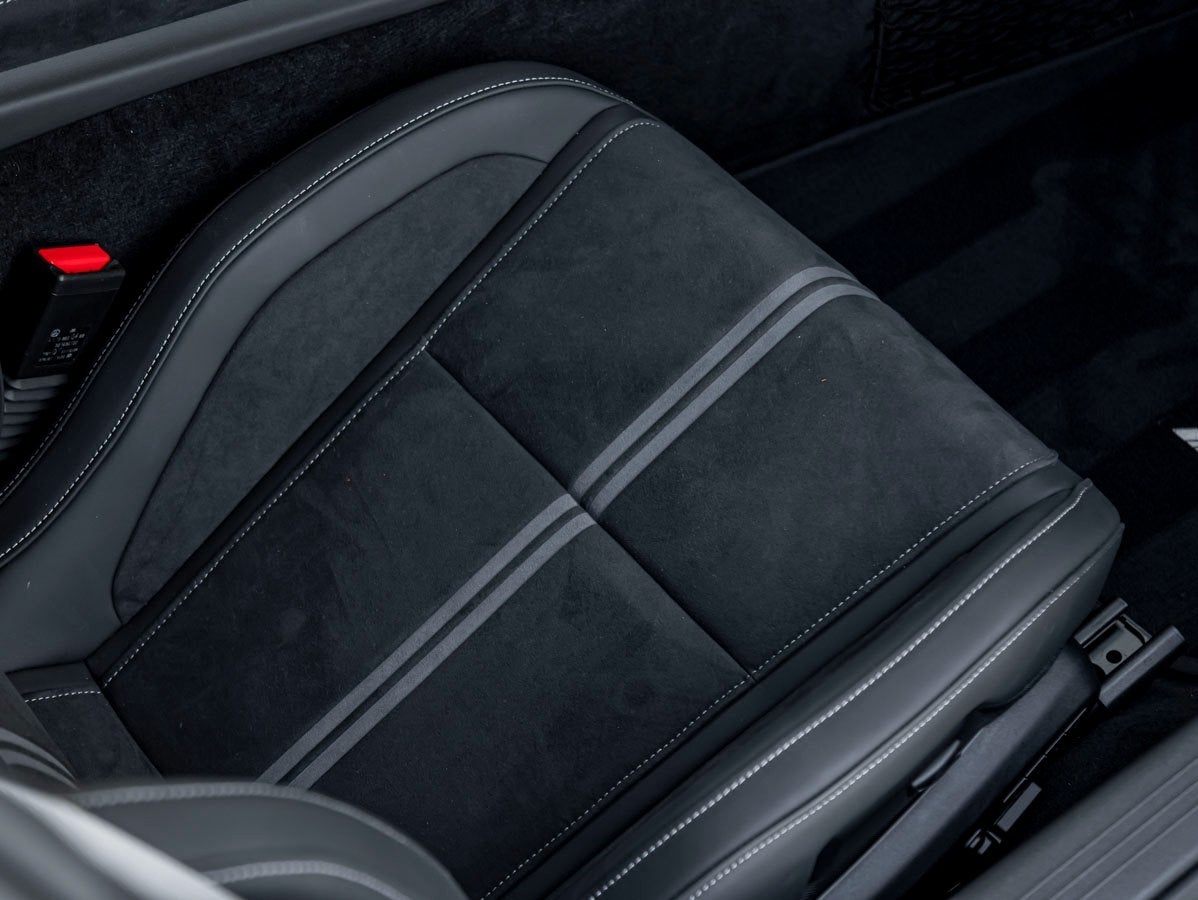 Inside, the cabin showcases a blend of motorsport functionality and luxury. The