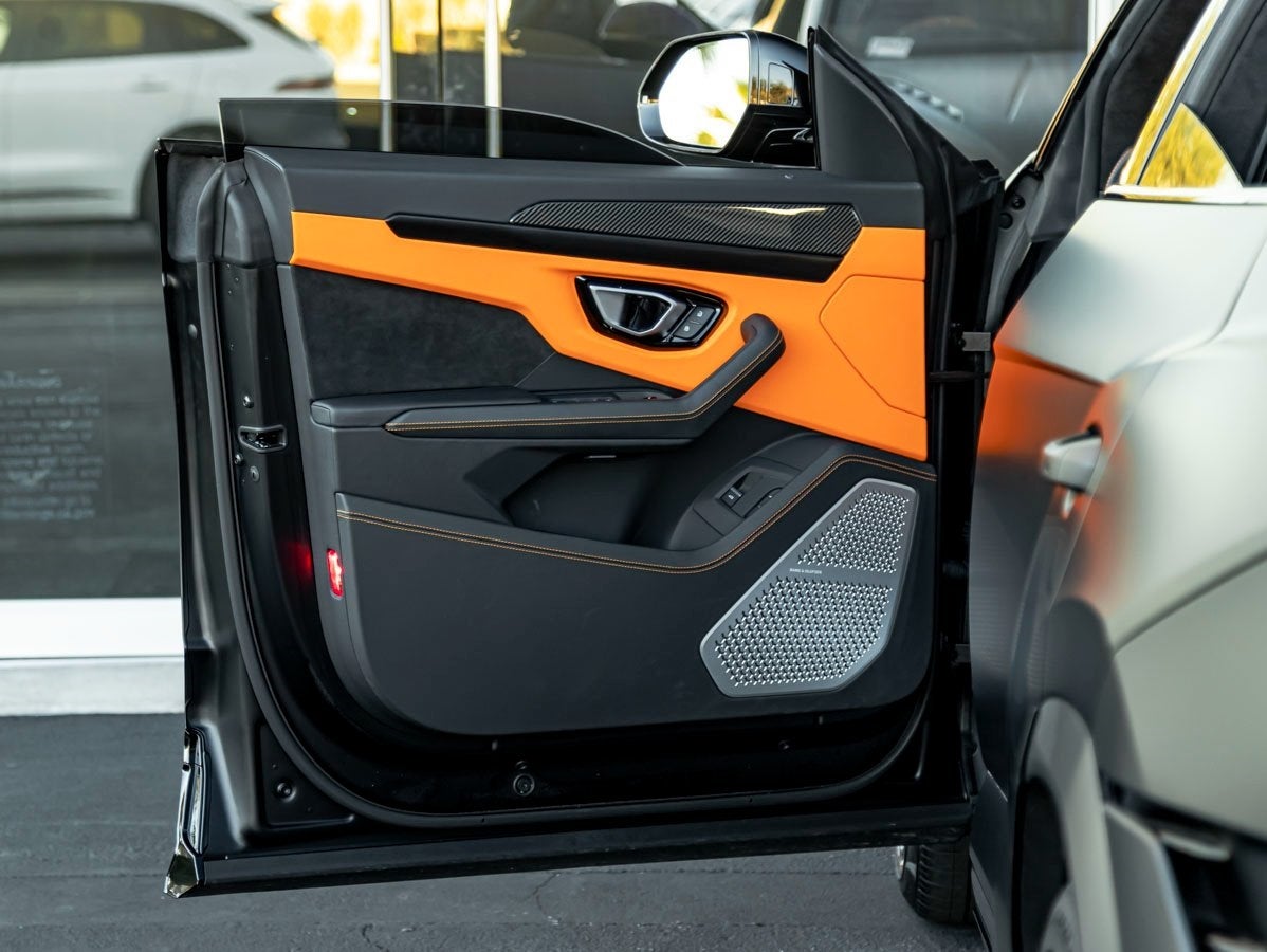 The Bicolor Sportivo leather interior features seat belts in Arancio, optional stitching, Lamborghini embroidery, interior carbon fiber, full electric front seats, 4-seat configuration, ambient lighting, rear seat entertainment, sunblinds, and acoustic privacy glass.
