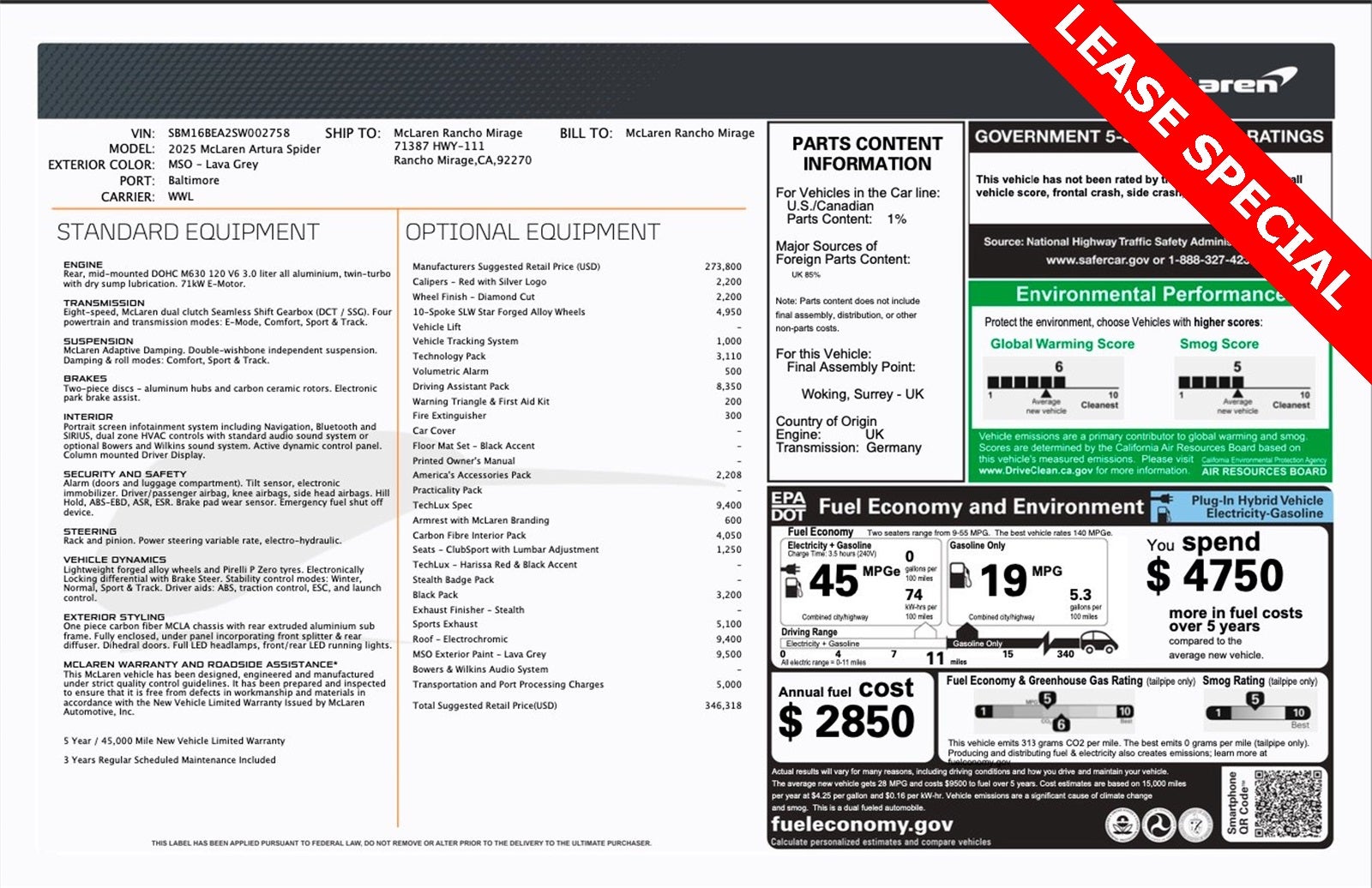 The Artura Spider stands as a beacon of design and performance, its Lava Grey exterior not just a color, but a badge of honor that reflects McLaren's illustrious racing heritage. Adorned with the distinctive Black Pack and featuring an advanced electrochromic roof, it presents a sleek and futuristic stance. The Technology Pack nods to McLaren’s commitment to cutting-edge innovation, and the America's Accessories Pack, along with the Driving Assistant Pack, enhances its allure and functionality.