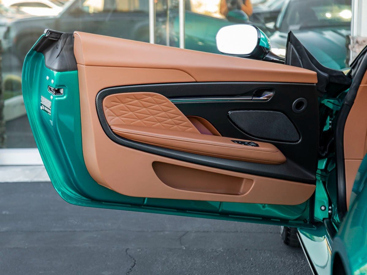 The exterior of this 2026 DB12 makes an unmistakable statement with its sleek Podium Green finish, complemented by the aggressive Lower Exterior Black Pack and darkened Smoked Rear Lamps. The elegant silhouette is further enhanced by a Panoramic Glass Roof that floods the cabin with natural light, and 21-Inch Multi-Spoke Forged Wheels Satin Black with Infographic Detailing that emphasize the cars athletic stance. Every line and contour is sculpted for aerodynamic precision and road-dominating presence.
